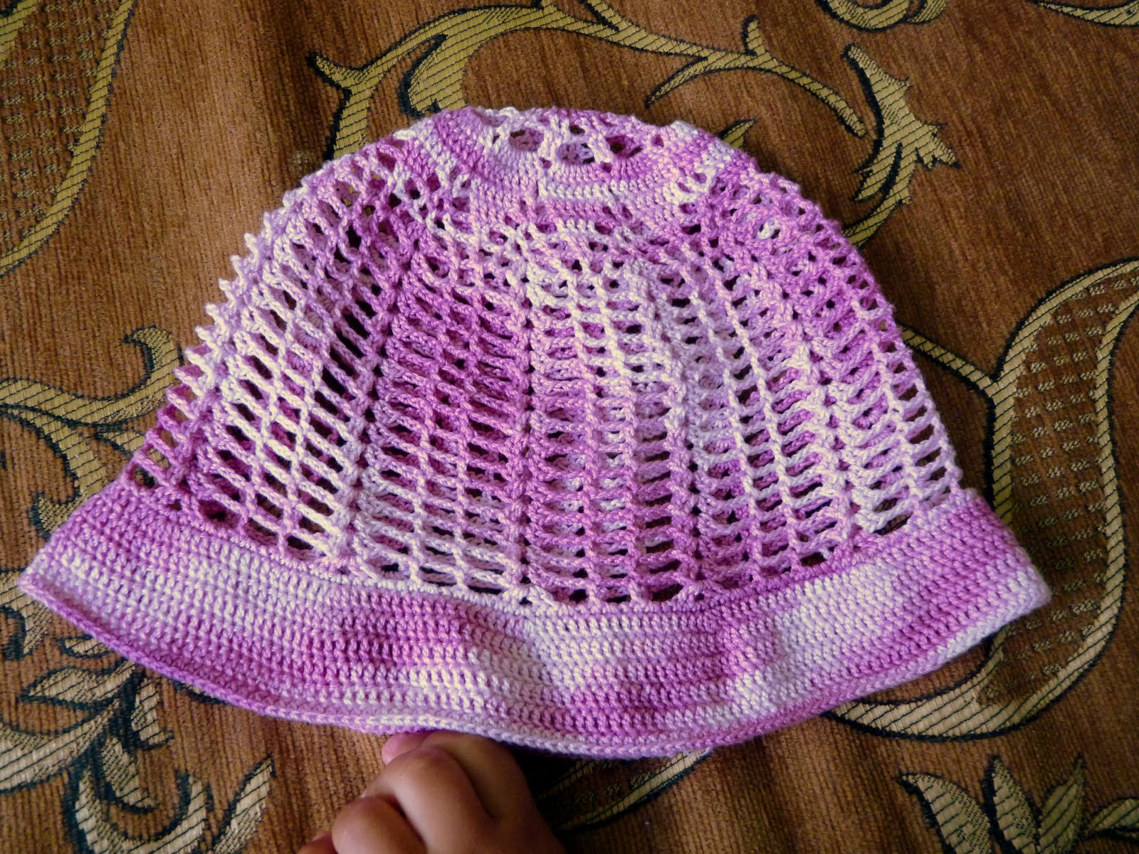 ...и тем самым даёт мне новые задания)Шапочка комбинированная, дно и тулья отсюда, а поля решила сделать максимально от солнца закрывающими, поскольку шапки нам только для этого и нужны=)